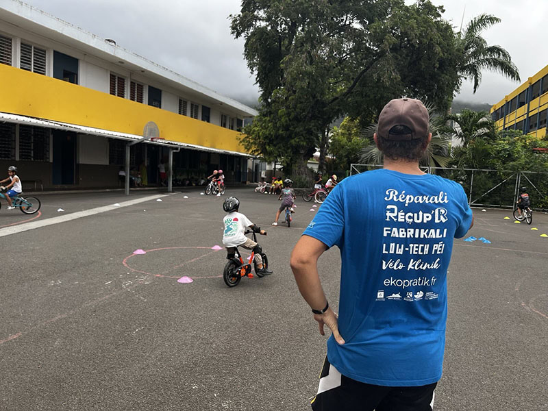 À l’initiative de Markotaz, deux semaines avant l’événement, un cycle de séances a été animé par Ekopratik et les bénévoles de la Vélo-ékole les camélias, Amaury BILLET et Frédéric BUER. Ce cycle était proposé à la SPL Oser Pour l’Éducation (SPL OPE), association dédiée à l’accueil en périscolaire et mercredi jeunesse. Six séances se sont déroulées dans le bâtiment de l’école élémentaire les Camélias, dans le quartier de la Source à Saint-Denis. Durant le temps périscolaire une vingtaine d’élèves entre 7 et 10 ans ont pu découvrir une action d’écologie pratique.