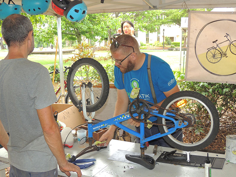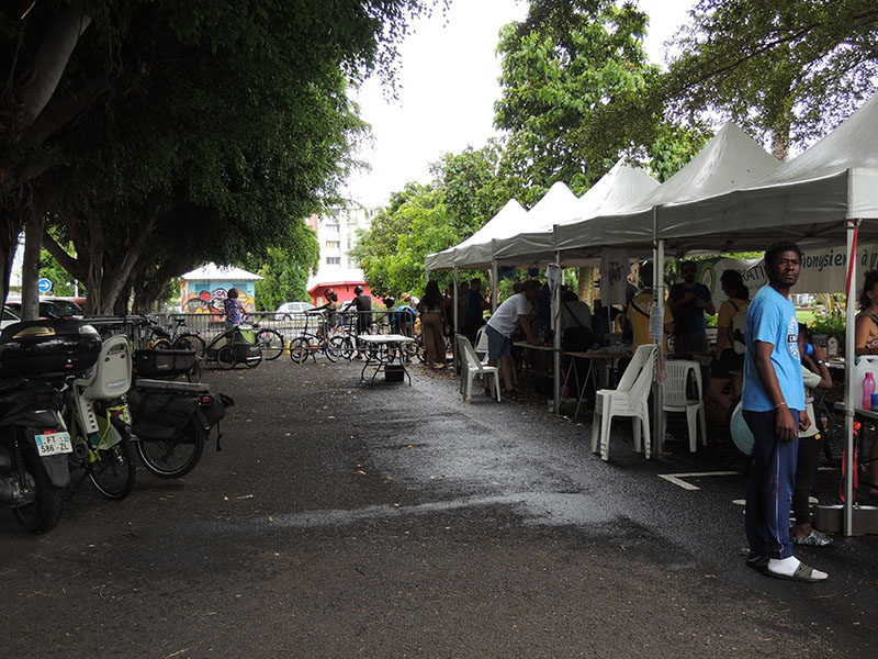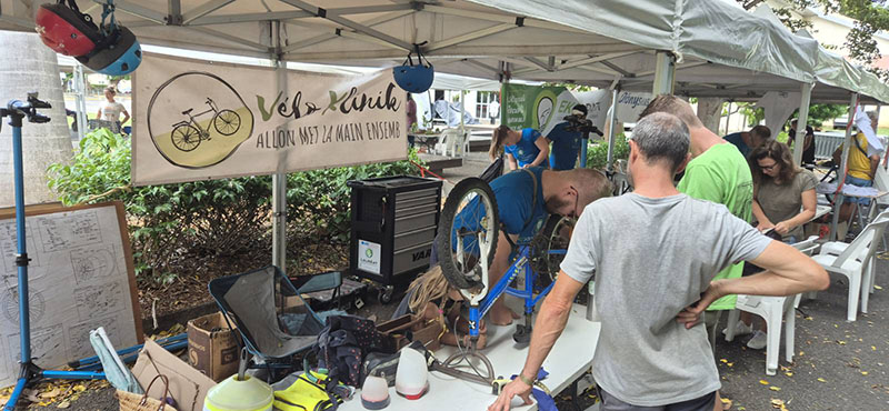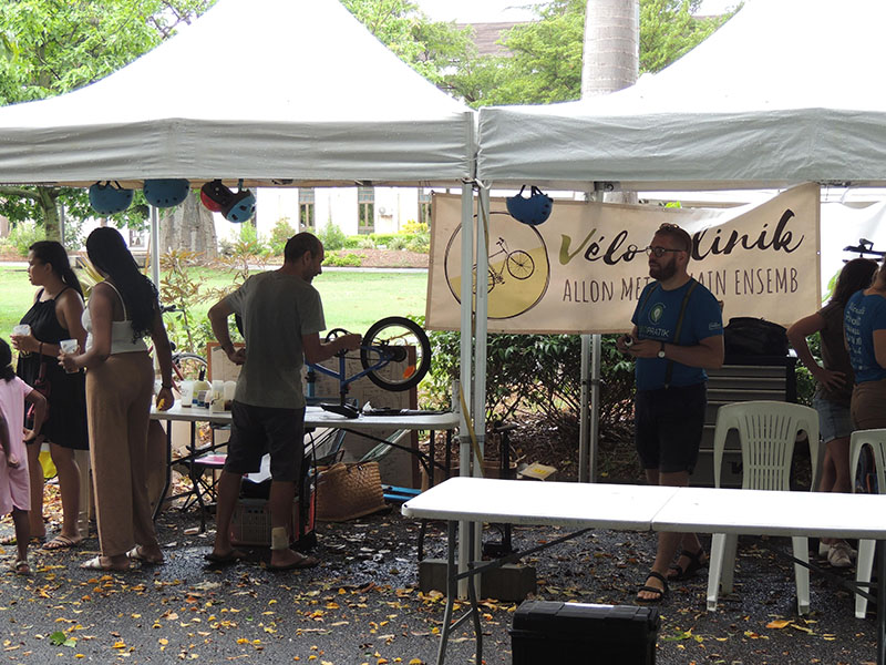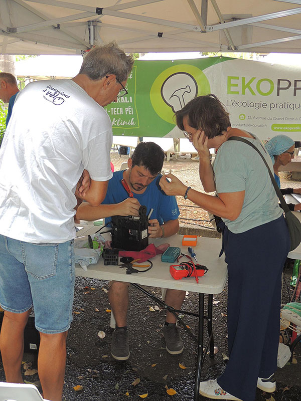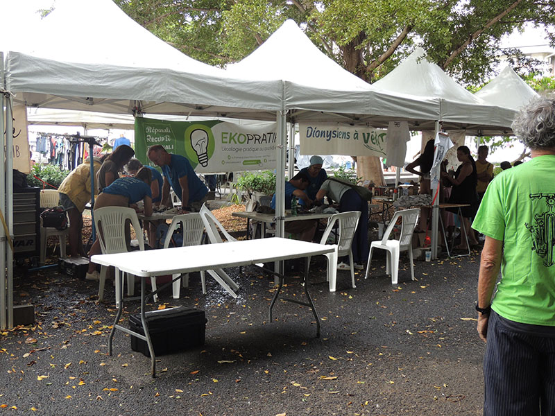 Durant l’après-midi l’association Ekopratik a mis en place quatre ateliers : une Vélo-ékole, plusieurs personnes dont beaucoup d’enfants ont pu profiter de l’espace dédié ; un atelier d’auto-réparation Vélo Klinik a aidé à la réparation de plusieurs vélos ; et un atelier Répar’à li a permis aux personnes de venir avec de l’électronique à remettre en état. Un vélo blender était aussi mis à disposition de l’équipe Zéro déchet pour servir des jus de fruits frais.